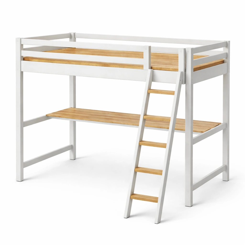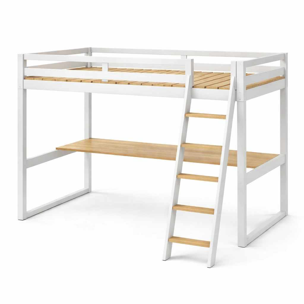 Cama loft Alta con Escritorio, Madera de Pino Blanco y Natural