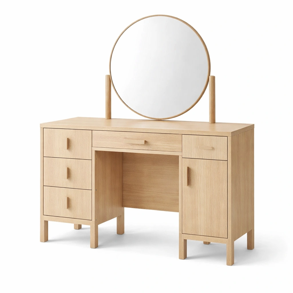 Tocador de madera con espejo circular y cajones